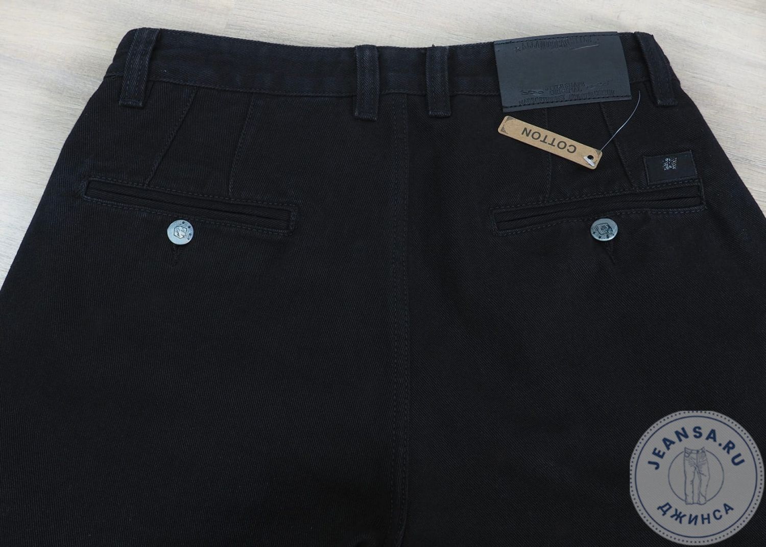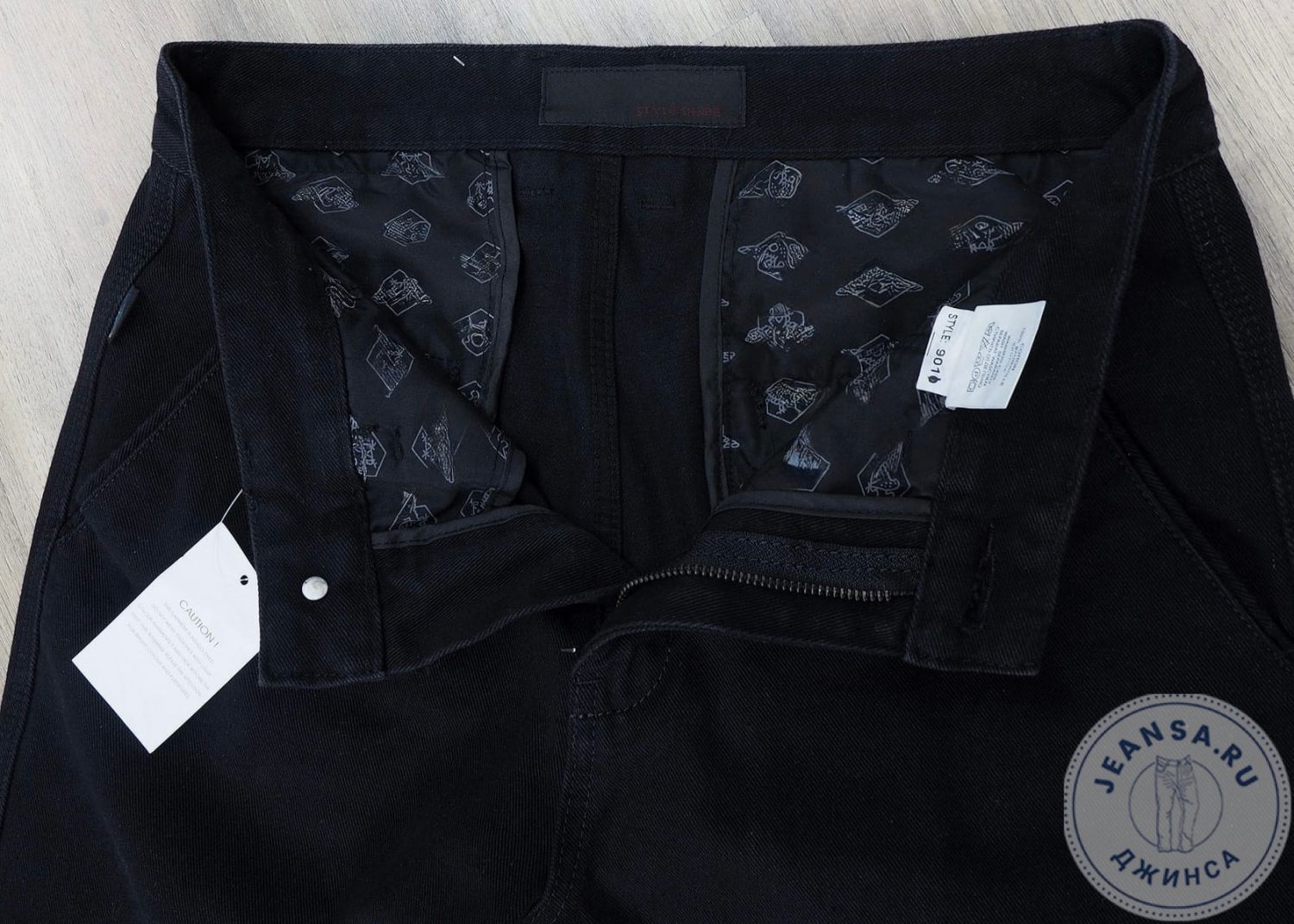 Джинсы с боковыми косыми карманами, задние прорезные на пуговице, впереди справа маленький потайной карман.
