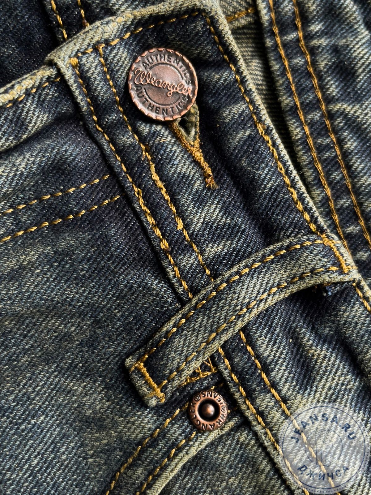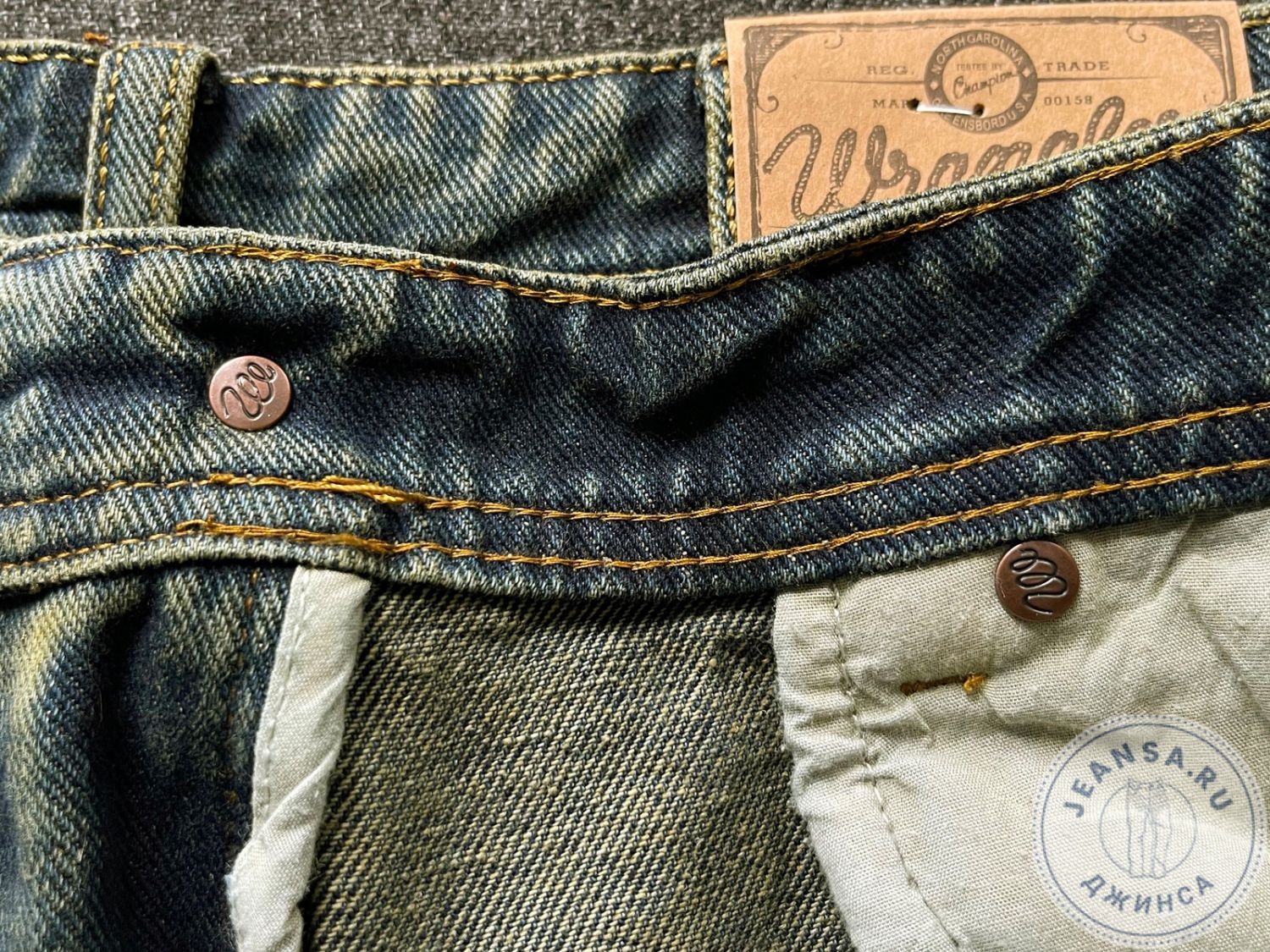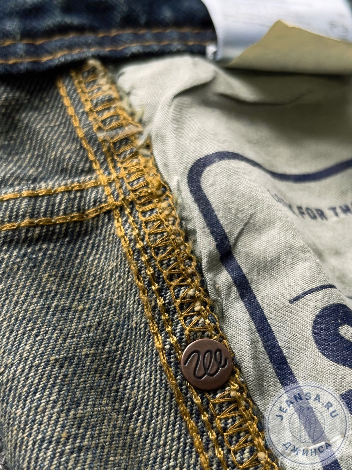 Задние карманы прошиты тройным швом и усилены заклепками, декоративный патч