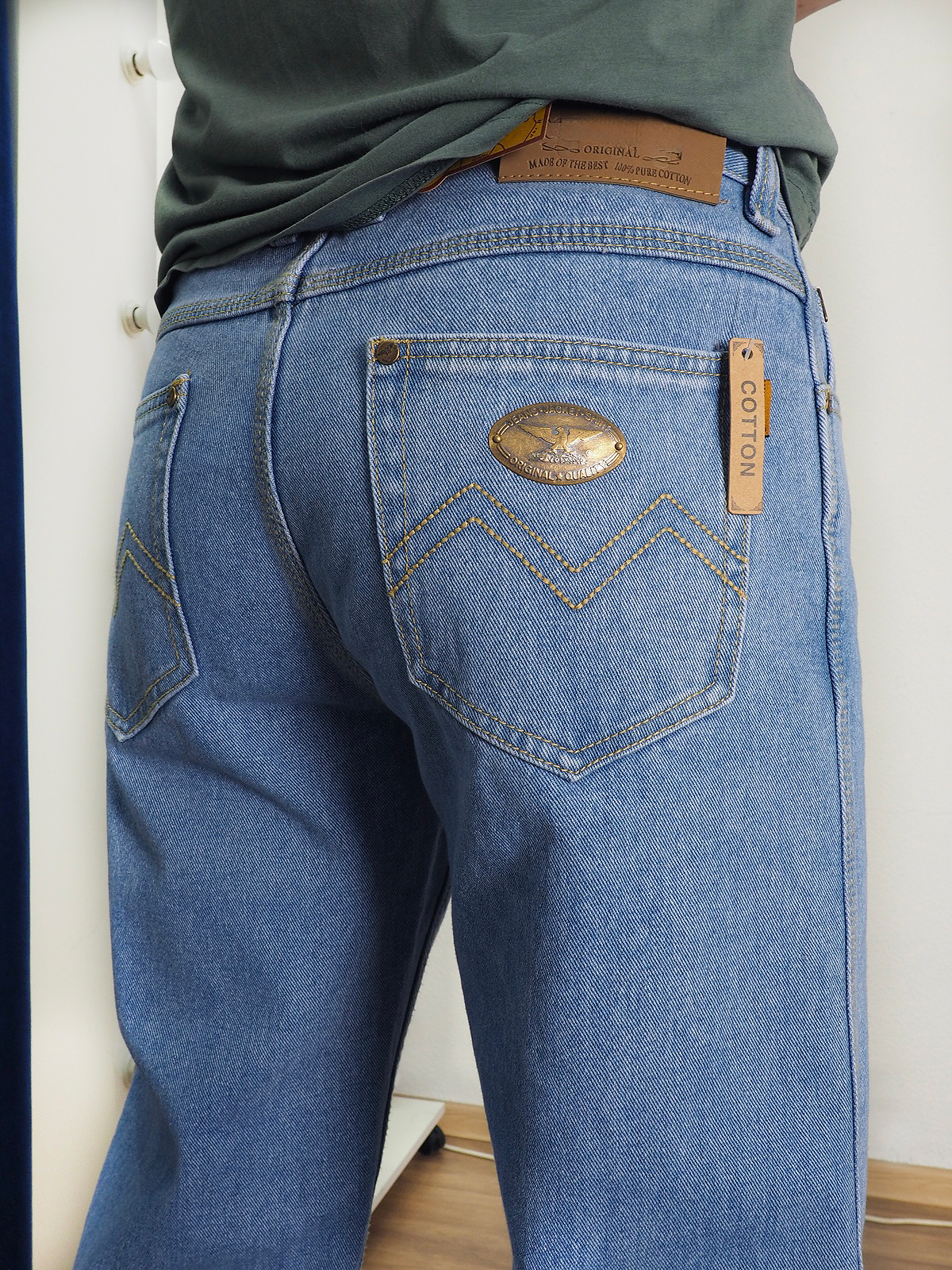 Мужские джинсы классического прямого кроя из вареной джинсовой ткани, средней плотности, не растяжимы. У модели по бокам штанины прошит..